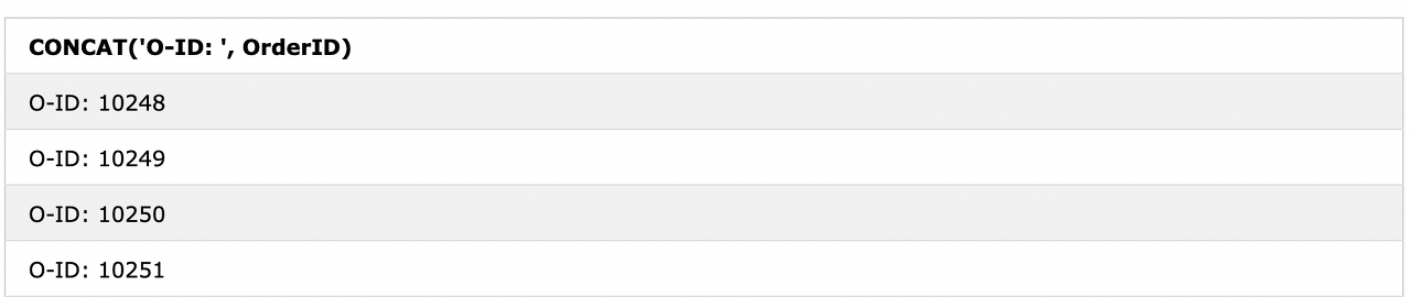 SELECT CONCAT('O-ID: ', OrderID) FROM Orders;
