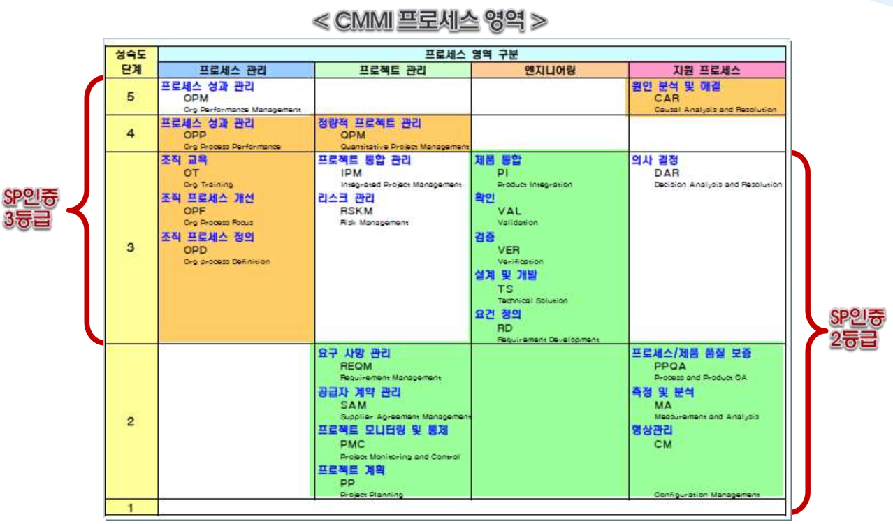 CMMi 프로세스 영역은 process management, project management, engineering, support로 4가지로 구성되어 있으며 SP 인증의 프로세스 영역이 프로젝트 관리 영역, 개발 영역, 지원 영역, 조직 관리 영역 , 프로세스 개선 영역으로 총 5가지로 구분되어 있다는 점도 차이점이다.