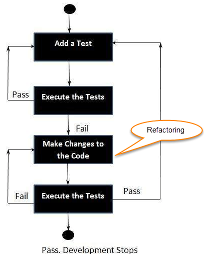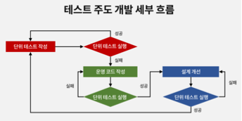 TDD를 개발하기 위해서는 테스트를 만들고 그에 맞는 코드를 쓰기 위해서 반복해야 한다. 이를 간단하게 도식화 하여 나타내면 다음과 같다.